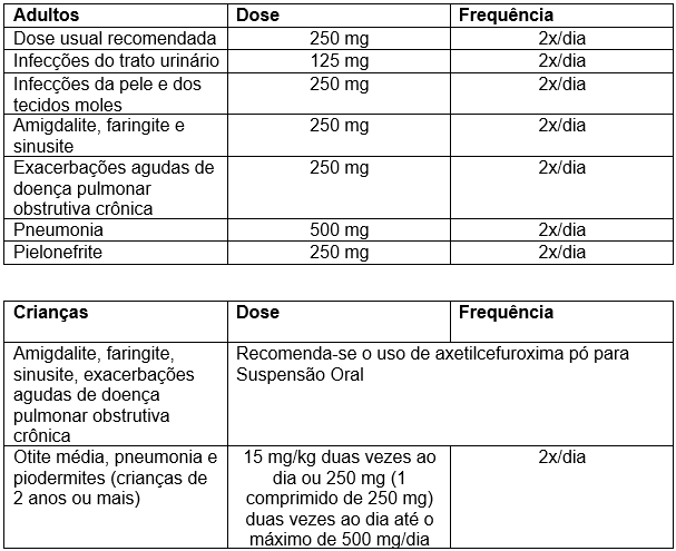 • Sinusite: causada por S. pneumoniae, H. influenzae e anaeróbios sensíveis à cefuroxima. A suscetibilidade a axetilcefuroxima pode variar de acordo com a localidade e temporalmente, devendo ser utilizado de acordo com os guias locais de prescrição de antibióticos e dados e dados locais devem ser consulta.