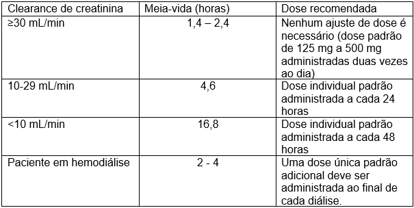 A segurança e eficácia de cefuroxima em pacientes com insuficiência renal não foram estabelecidas. A cefuroxima é primariamente excretada pelos rins. Em pacientes com função renal significativamente prejudicada recomenda-se que a dose de cefuroxima seja reduzida para compensar sua excreção mais lenta (vide tabela abaixo). A cefuroxima é efetivamente removida por diálise