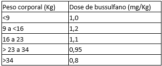 Após a 16ª dose de bussulfano esperar 24 horas e iniciar 4 ciclos de ciclofosfamida a 50mg/kg ou melfalano a 140mg/m2