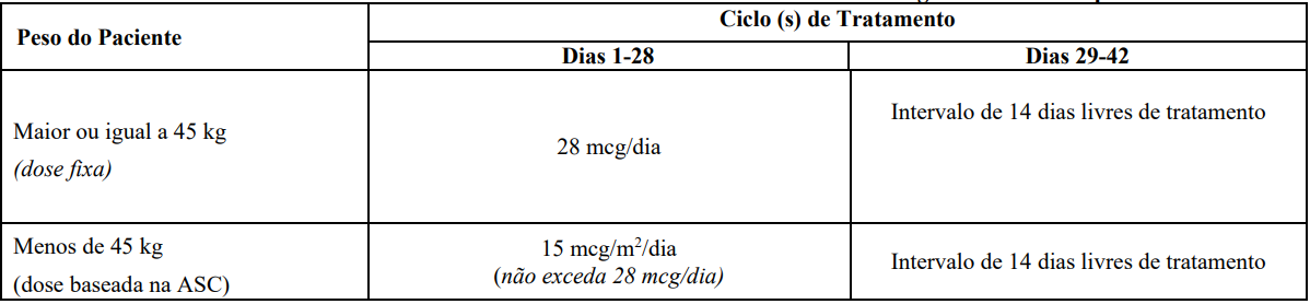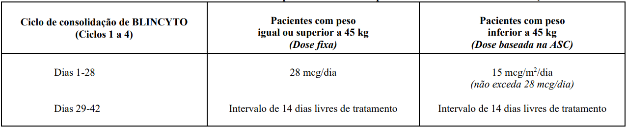 BLINCYTO é administrado como uma infusão intravenosa contínua liberada em uma taxa de fluxo constante usando uma bomba de infusão. Um ciclo único de tratamento tem 28 dias (4 semanas) de infusão contínua seguido por um intervalo de 14 dias (2 semanas) livres de tratamento.