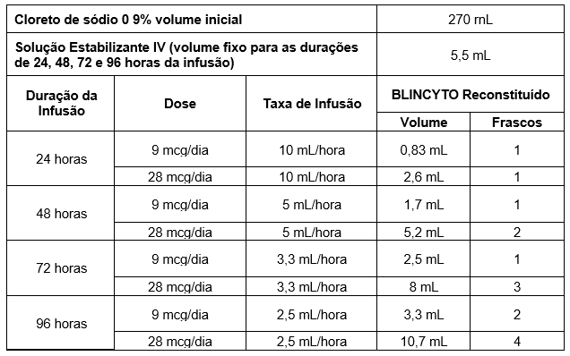 As bolsas de infusão de BLINCYTO devem ser preparadas para infundir por 24 horas, 48 horas, 72 horas, ou 96 horas.