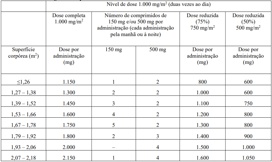– Câncer colorretal e gástrico: A dose inicial recomendada de Capecitabina é de 800 a 1.000 mg/m2 administrada duas vezes ao dia durante duas semanas, seguida de um período de sete dias de descanso, ou 625 mg/m2 duas vezes ao dia quando administrada continuamente.