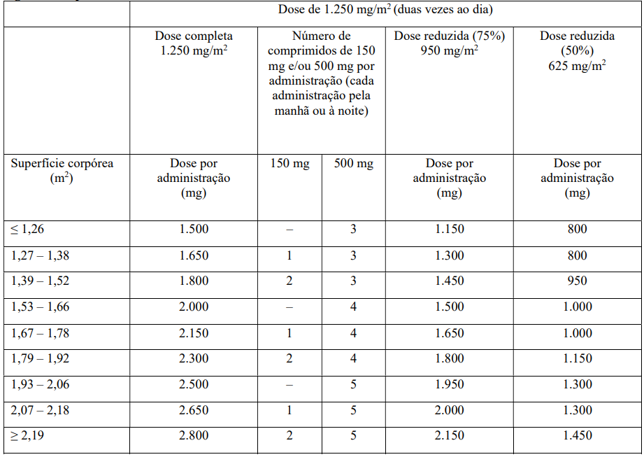 Recomendado 1.250 mg/m² – 2x/dia, por 14 dias, seguido de 7 dias de descanso.