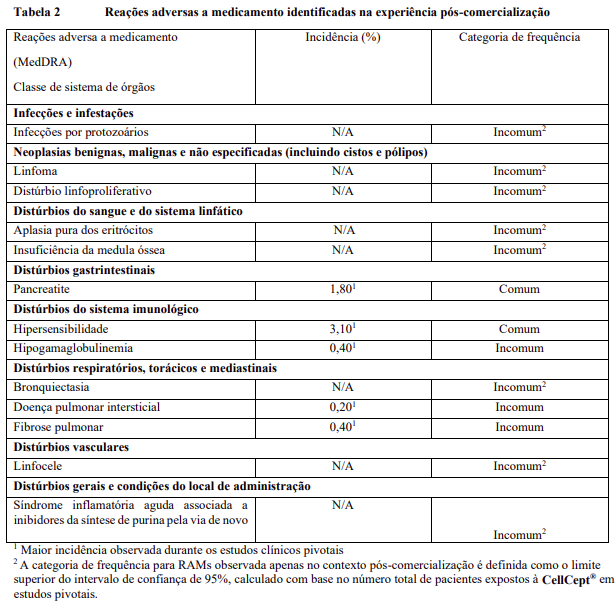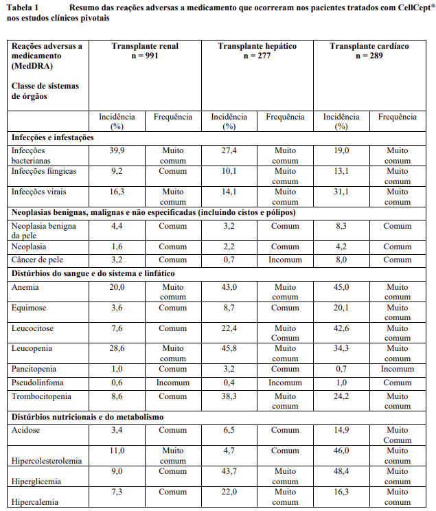 Nos estudos pivotais, diarreia, leucopenia, sepse e vômitos estavam entre as reações adversas mais comuns e / ou graves relacionadas ao uso de CellCept®. Houve também evidência de maior frequência de certos tipos de infecção, como por exemplo infecções oportunistas.