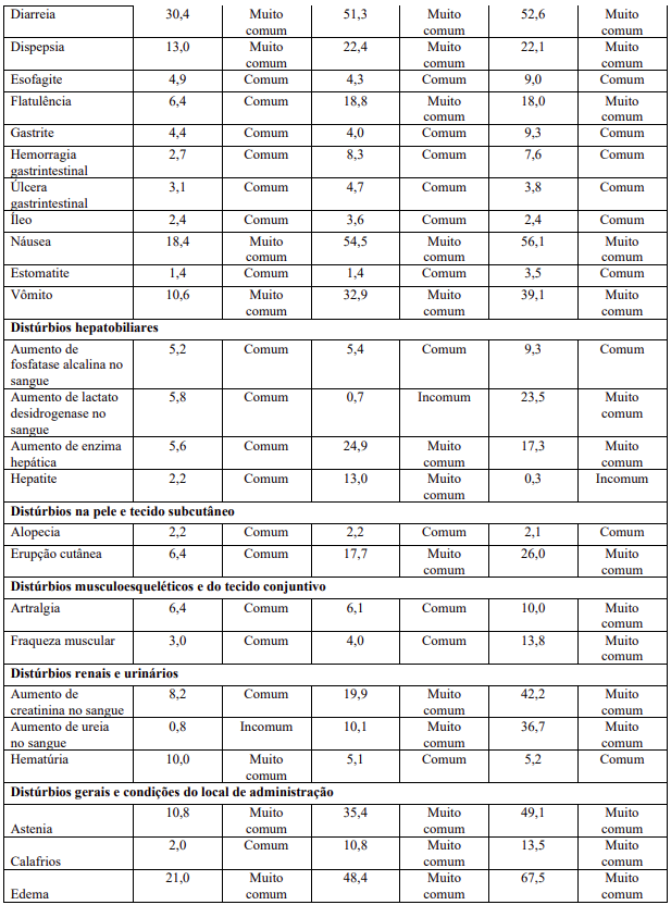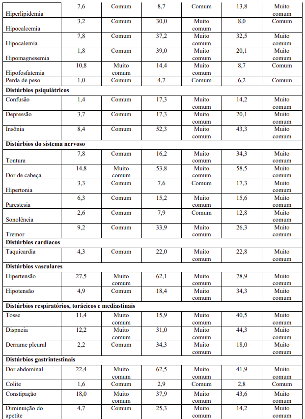As reações adversas na Tabela 2 estão listadas de acordo com a classe de sistema de órgãos MedDRA e a estimativa da categoria de frequência correspondente para cada reação adversa ao medicamento baseia-se na seguinte convenção: muito comum (≥1 / 10); comum (≥1 / 100 a <1/10); incomum (≥1 / 1.000 a <1/100); rara (≥1 / 10.000 a <1 / 1.000); muito rara (<1 / 10.000).