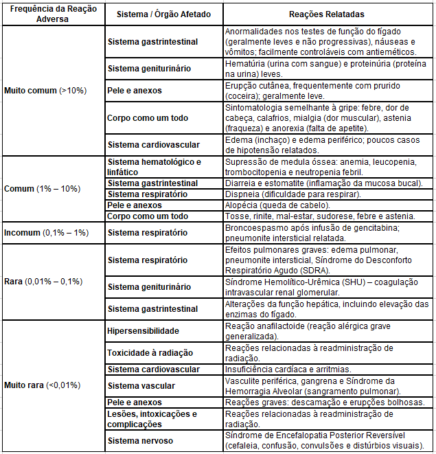 O aumento do tempo de infusão ou da frequência das doses pode elevar a toxicidade. A gencitabina pode causar supressão da medula óssea, manifestada por leucopenia, trombocitopenia e anemia.