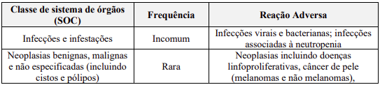 A exposição prévia ao vírus ou a infecção com o vírus da varicela zoster deve ser verificada antes do início do tratamento. Diretrizes locais podem ser consideradas, incluindo terapia profilática, se necessário. O teste sorológico antes do início do tratamento deve ser considerado em relação à hepatite B. Diretrizes locais podem ser consideradas, incluindo terapia profilática para casos que tenham testes sorológicos com resultado positivo. Se o paciente estiver infectado durante o tratamento, medidas apropriadas devem ser tomadas, que podem incluir terapia antiviral e cuidados de suporte.