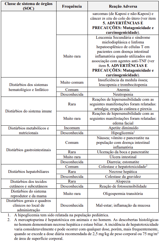 Não há documentação clínica atualizada sobre o efeito de Purinethol® que possam servir de base para determinar precisamente a frequência da ocorrência de efeitos adversos. As categorias de frequência atribuídas às reações adversas a medicamentos abaixo são estimativas: para a maioria das reações, dados adequados para o cálculo da incidência não estão disponíveis. Os efeitos adversos podem variar na sua incidência dependendo da dose recebida e, também quando administrados em combinação com outros agentes terapêuticos.