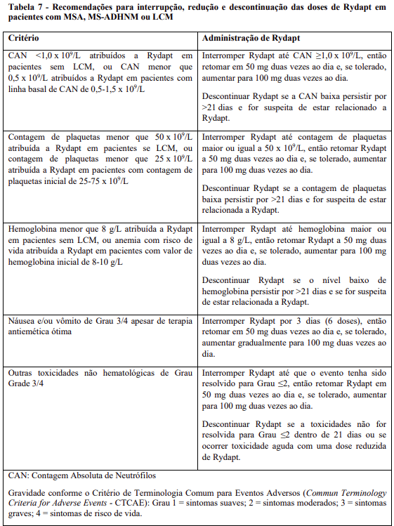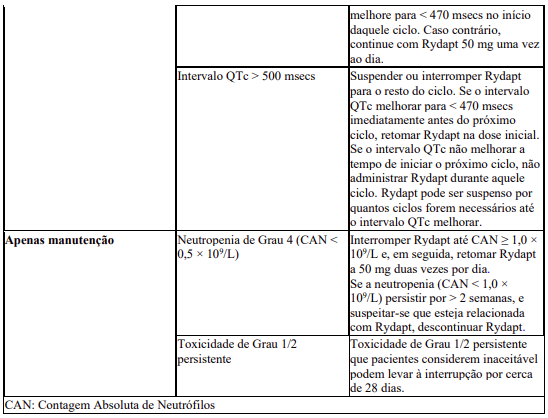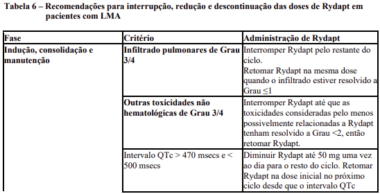 As recomendações para os ajustes da dose de Rydapt em pacientes com LMA são fornecidos na Tabela 6.
