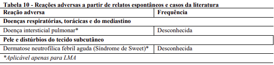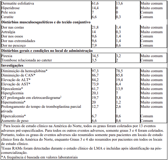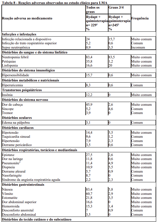 A Tabela 8 apresenta as categorias de frequência de RAMs relatadas no estudo de fase III em pacientes com LMA recém diagnosticada com mutação FLT3