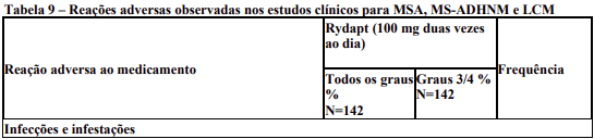A segurança de Rydapt (100 mg duas vezes ao dia) como monoterapia em pacientes com MSA, MSADHNM e LCM foi avaliada em 142 pacientes em 2 estudos de braço único, aberto e multicêntrico. A duração mediana de exposição a Rydapt foi 11,4 meses (intervalo: 0 a 81 meses).