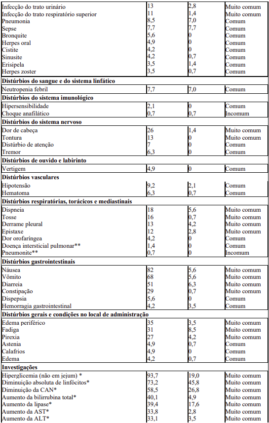 As RAMs mais frequentes foram náusea (82%), vômito (68%), diarreia (51%), edema periférico (35%) e fadiga (31%). As RAMs de Grau 3/4 mais frequentes foram fadiga (8,5%), sepse (7,7%), pneumonia (7%), neutropenia febril (7%) e diarreia (6,3%). As anormalidades laboratoriais não hematológicas mais frequentes são hiperglicemia (93,7%), bilirrubina total aumentada (40,1%), lipase aumentada (39,4%), aspartato aminotransferase aumentada (AST) (33,8%) e alanina aminotransferase aumentada (ALT) (33,1%), enquanto as anormalidades laboratoriais hematológicas mais frequentes foram contagem absoluta de linfócitos diminuída (45,8%), CAN diminuída (26,8%), hiperglicemia (19%) e lipase aumentada (17,6%).