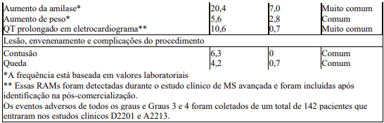As RAMs são listadas de acordo com a classe dos sistemas de órgãos do MedDRA. Dentro de cada classe de sistemas de órgãos, as RAMs são classificadas pela frequência, com as reações mais frequentes em primeiro lugar, utilizando a seguinte convenção: muito comum (≥ 1/10); comum (≥ 1/100, < 1/10); incomuns (≥ 1/1.000 a < 1/100); raras (≥ 1/10.000 a < 1/1.000); muito raras (< 1/10.000); desconhecidas (não podem ser estimadas a partir dos dados disponíveis). Dentro de cada grupo de frequência, as reações adversas estão apresentadas por ordem decrescente de gravidade.