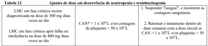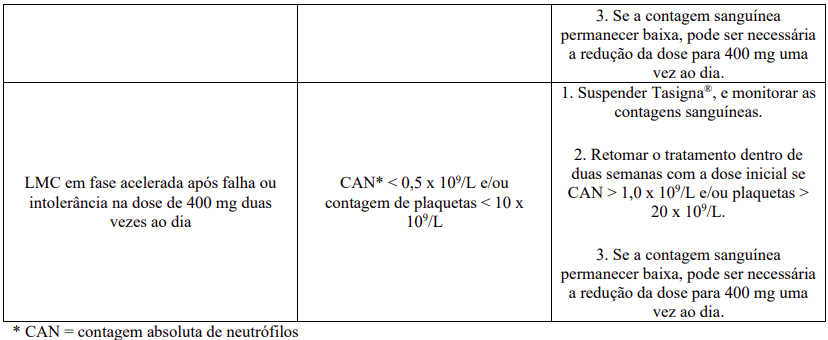 O tratamento com Tasigna® está frequentemente associado à trombocitopenia, neutropenia e anemia (NCI CTC – National Cancer Institute Common Toxicity Criteria – Graus 3/4). Esta ocorrência é mais frequente em pacientes com LMC após falha ou intolerância ao imatinibe e em particular em pacientes com LMC-FA. Contagem sanguínea completa deve ser realizada a cada duas semanas nos dois primeiros meses e depois, mensalmente, ou quando clinicamente indicado. Mielossupressão foi geralmente reversível e normalmente controlada com interrupção temporária do tratamento com Tasigna® ou diminuição da dose.