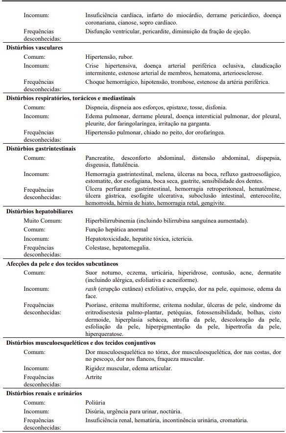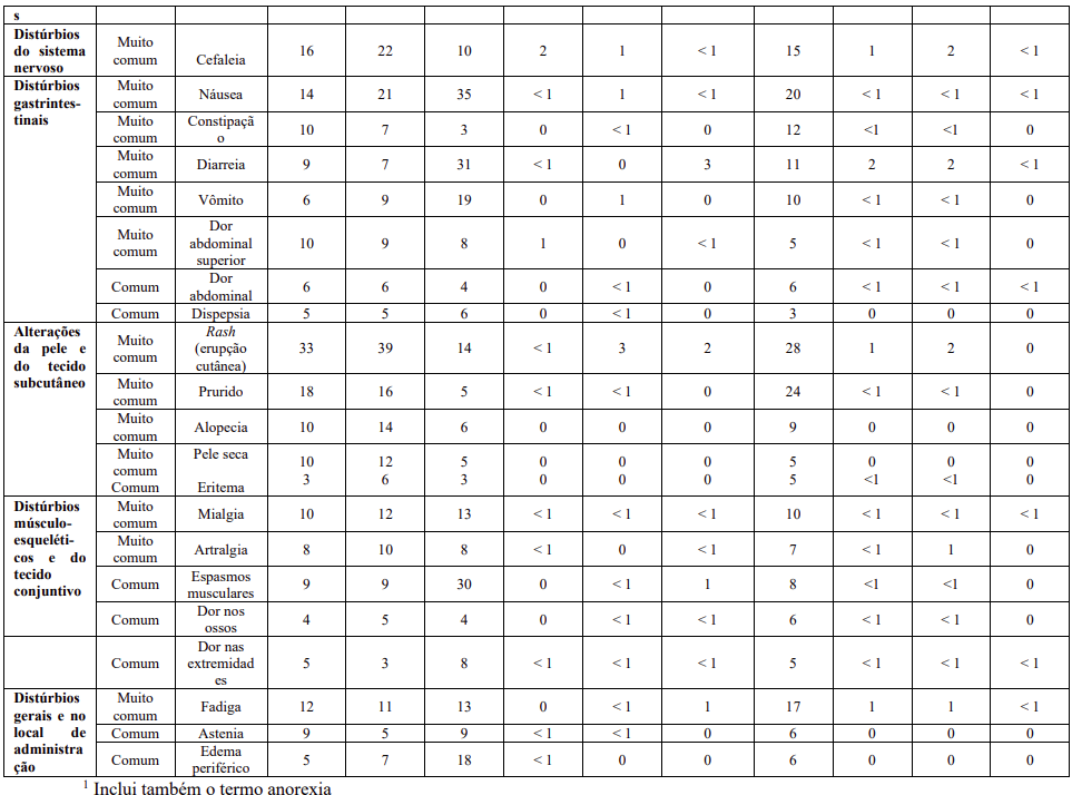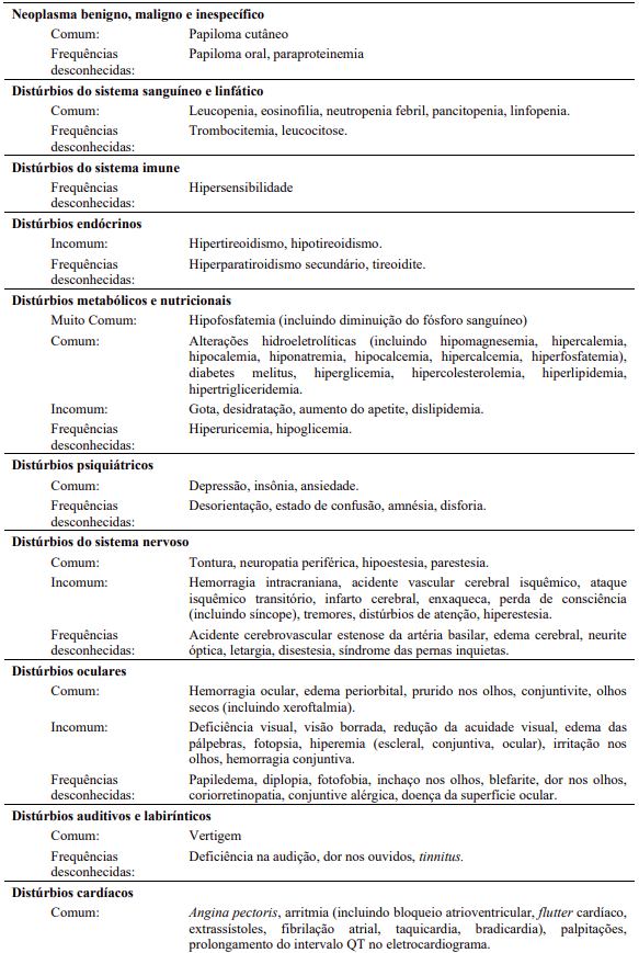 Reações adversas hematológicas incluem mielossupressão: trombocitopenia (31%), neutropenia (17%) e anemia (14%). Vide Tabela 15 – Reações adversas de Graus 3/4 – Alterações laboratoriais.