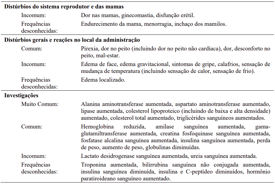 Foi observada elevação na lipase sérica. Recomenda-se cautela em pacientes com história prévia de pancreatite. Caso as elevações de lipase sejam acompanhadas por sintomas abdominais, a dose deve ser interrompida e um diagnóstico apropriado deve ser considerado para excluir a pancreatite.