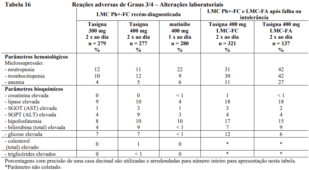 No grupo do nilotinibe de 300 mg duas vezes ao dia, reações adversas hematológicas incluem mielossupressão: trombocitopenia (18%), neutropenia (15%), e anemia (8%). Reações adversas bioquímicas incluem aumento da alanina aminotransferase (24%), hiperbilirrubinemia (16%), aumento da aspartato aminotransferase (12%), aumento de lipase (11%), aumento de bilirrubina sanguínea (10%), hiperglicemia (4%), hipercolesterolemia (3%) e hipertrigliceridemia (< 1%). Vide Tabela 15 para anormalidades laboratoriais de Graus 3 e 4.