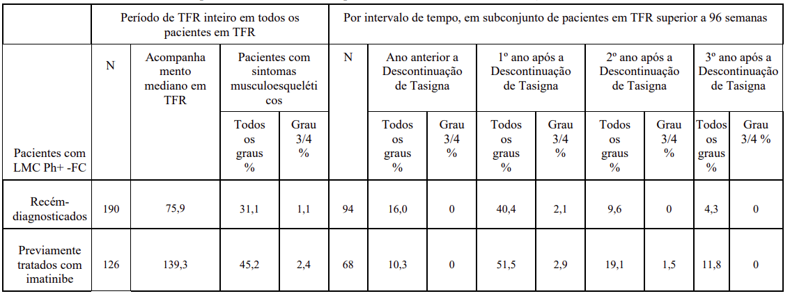 Após a descontinuação do tratamento com Tasigna® no âmbito de tentativa de remissão livre de tratamento (TFR), sintomas musculoesqueléticos (por exemplo, mialgia, dores nas extremidades, artralgia, dor óssea, dor na coluna ou dor musculoesquelética), foram relatados com mais frequência do que antes da descontinuação do tratamento no primeiro ano, conforme observado na Tabela 17. A taxa de novos sintomas osteomusculares geralmente diminuiu no segundo ano após a descontinuação do tratamento.