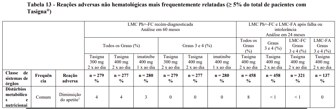 As seguintes reações adversas foram relatadas em pacientes dos estudos clínicos com Tasigna®, que servem como base para as indicações listadas, na dose recomendada com uma frequência menor que 5% (comuns ≥ 1/100 a < 1/10; incomuns ≥ 1/1000 a < 1/100; eventos únicos são capturados como de frequência desconhecida). Para anormalidades laboratoriais, eventos muitos comuns (> 1/10) não incluídos na Tabela 13 também são relatados. As reações adversas foram incluídas com base na relevância clínica e classificadas em ordem decrescente de gravidade dentro de cada categoria, obtidas a partir de dois estudos clínicos: 1-) análise de 60 meses para Ph+ LMC-FC recém diagnosticada; 2-) análise de 24 meses para LMC Ph+-FC e LMC-FA resistente ou intolerante.