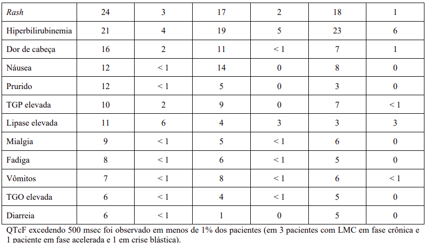 Adicionalmente, o estudo 2109, um estudo fase 3, aberto, multicêntrico, internacional, cujo objetivo primário foi o de confirmar o perfil de segurança do nilotinibe numa população maior de pacientes está relatado abaixo. O estudo 2109 envolveu pacientes adultos com LMC em fase crônica, fase acelerada e crise blástica, resistentes ou intolerantes ao imatinibe.