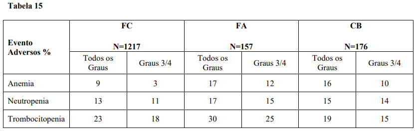 A tabela 15 sumariza os eventos adversos hematológicos observados.