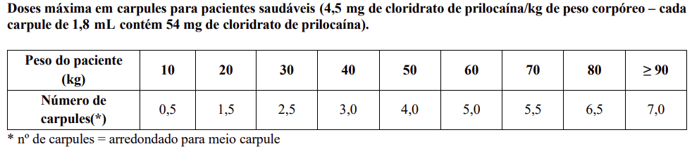 Doses Indicadas: A dose máxima de Citocaína® 3% é de 4,5 mg/kg de peso corpóreo sem ultrapassar 400 mg (equivalente a 7 carpules); a dose deve ser reduzida em pacientes clinicamente comprometidos, debilitados ou idosos. Recomenda-se que pacientes cardiopatas e demais comprometimentos sistêmicos relatados anteriormente, recebam no máximo 5 carpules por consulta.