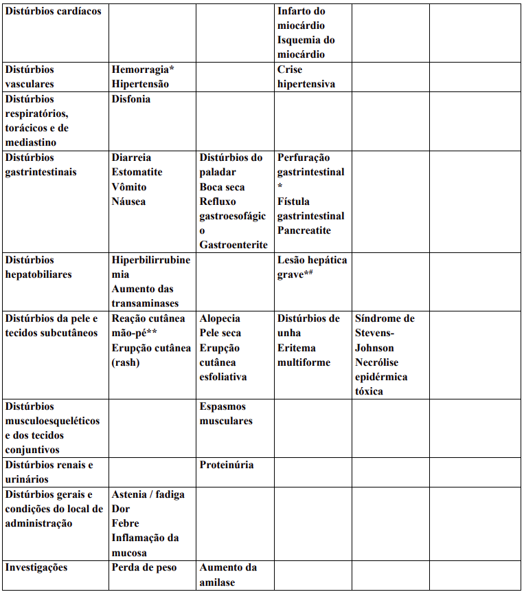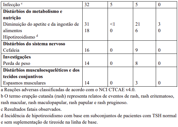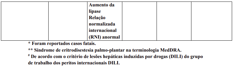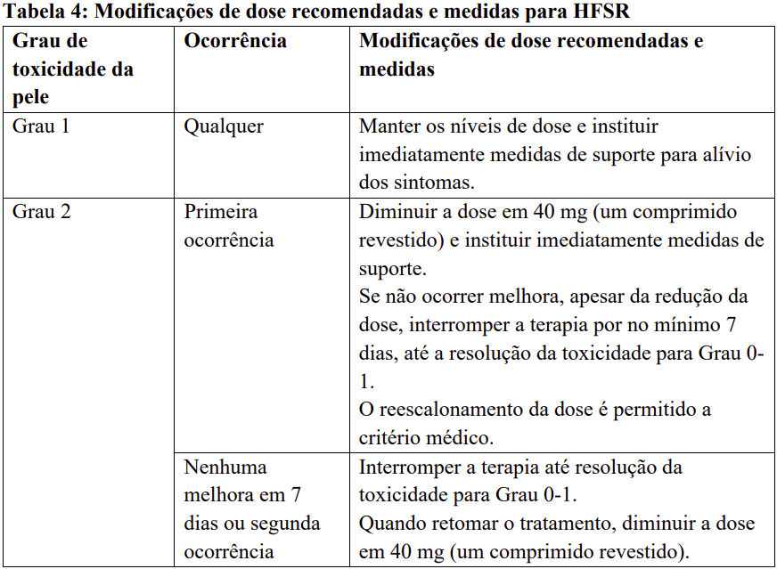 Para modificações recomendadas da dose e medidas em caso de reações cutâneas mão-pé (HFSR/síndrome de eritrodisestesia palmo-plantar) – veja Tabela 4.