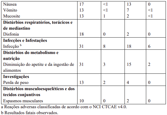 Reações adversas estão agrupadas de acordo com a sua frequência. Os grupos de frequência são definidos pela seguinte convenção: Muito comum: ≥ 1 / 10; Comum: ≥ 1 / 100 a < 1 / 10; Incomum: ≥ 1 / 1.000 a < 1 / 100; Rara: ≥ 1 / 10.000 a < 1 / 1.000; Desconhecida (não pode ser estimada a partir dos dados disponíveis).