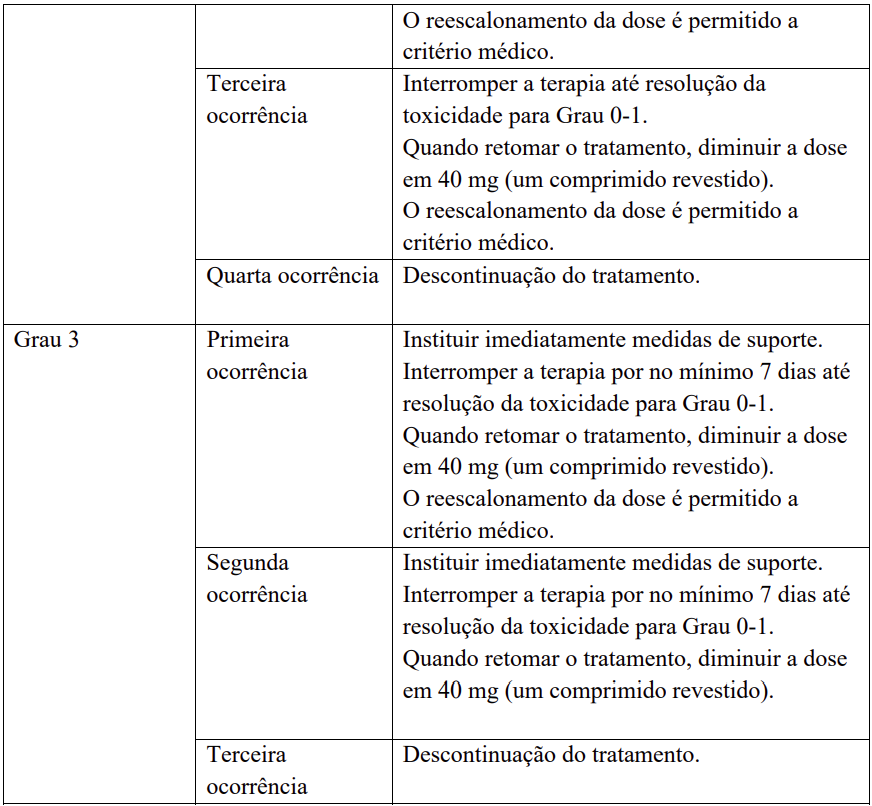 A interrupção e/ou redução da dose podem ser necessárias baseado na segurança e tolerabilidade individual. Modificações da dose devem ser aplicadas a cada 40mg (um comprimido). A dose diária mais baixa recomendada é de 80mg. A dose diária máxima é de 160mg.