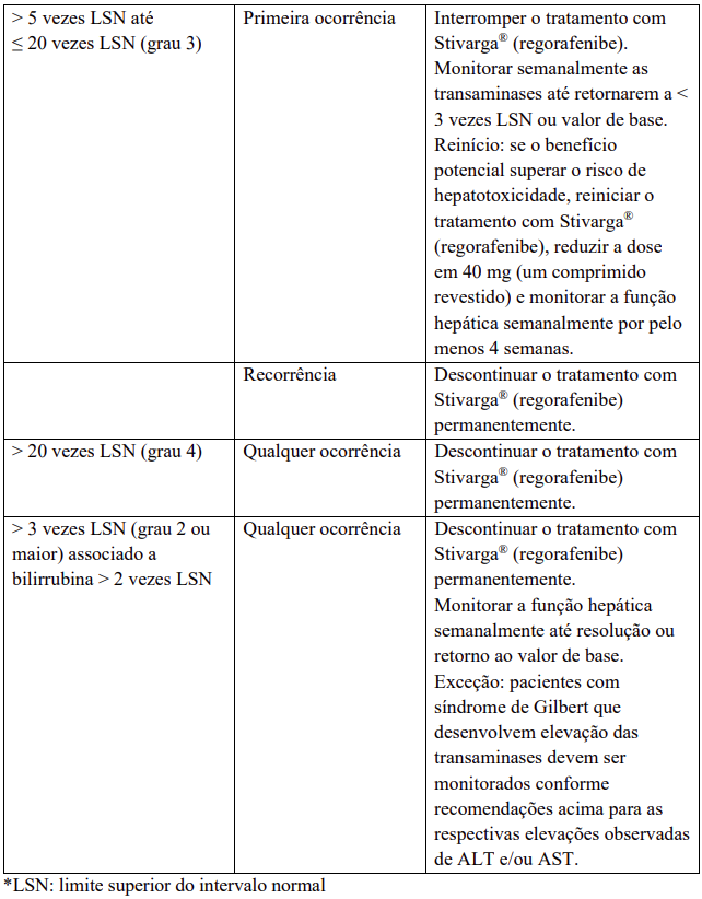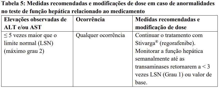 Para medidas recomendadas e modificações de dose em caso de agravamento dos testes de função hepática considerados relacionados ao tratamento com regorafenibe, veja Tabela 5.