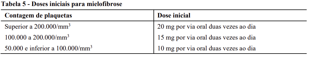 Para pacientes com MF: As doses podem ser tituladas com base na eficácia e segurança. Caso a eficácia seja considerada insuficiente e as contagens de células sanguíneas estiverem adequadas, as doses podem ser aumentadas em um máximo de duas doses diárias de 5mg, até a dose máxima de 25mg duas vezes ao dia. A dose inicial não deve ser aumentada nas primeiras quatro semanas de tratamento e, posteriormente, não mais frequentemente do que em intervalos de 2 semanas. O tratamento deve ser interrompido para contagens de plaquetas inferiores a 50.000/mm3 ou contagens de neutrófilos absolutos inferiores a 500/mm3. Após a recuperação das contagens sanguíneas acima destes níveis, a dosagem pode ser reiniciada a 5mg duas vezes por dia e aumentada gradualmente com base numa monitorização cuidadosa das contagens de células sanguíneas. As reduções de dose devem ser consideradas se a contagem plaquetária diminuir abaixo de 100.000/mm3 com o objetivo de evitar interrupções na dose para trombocitopenia.