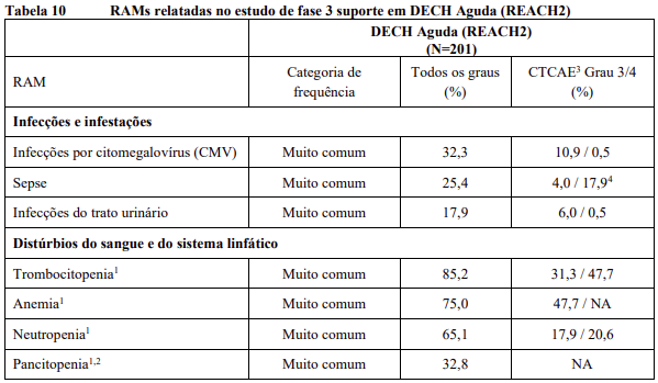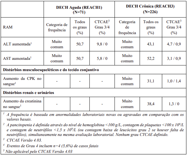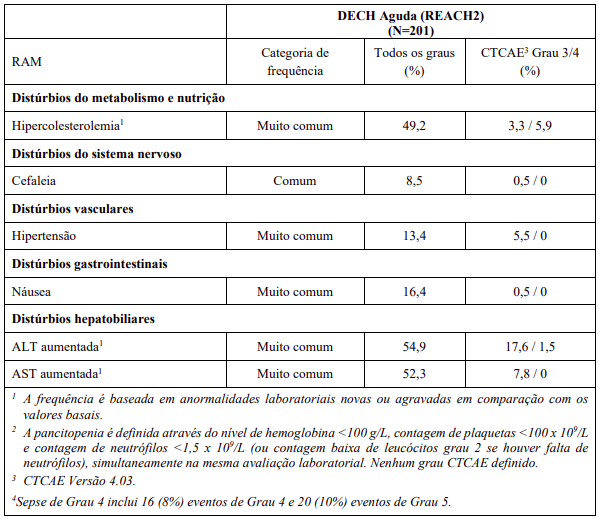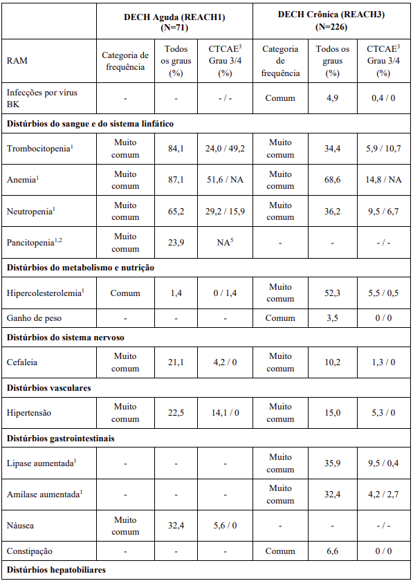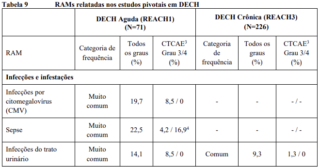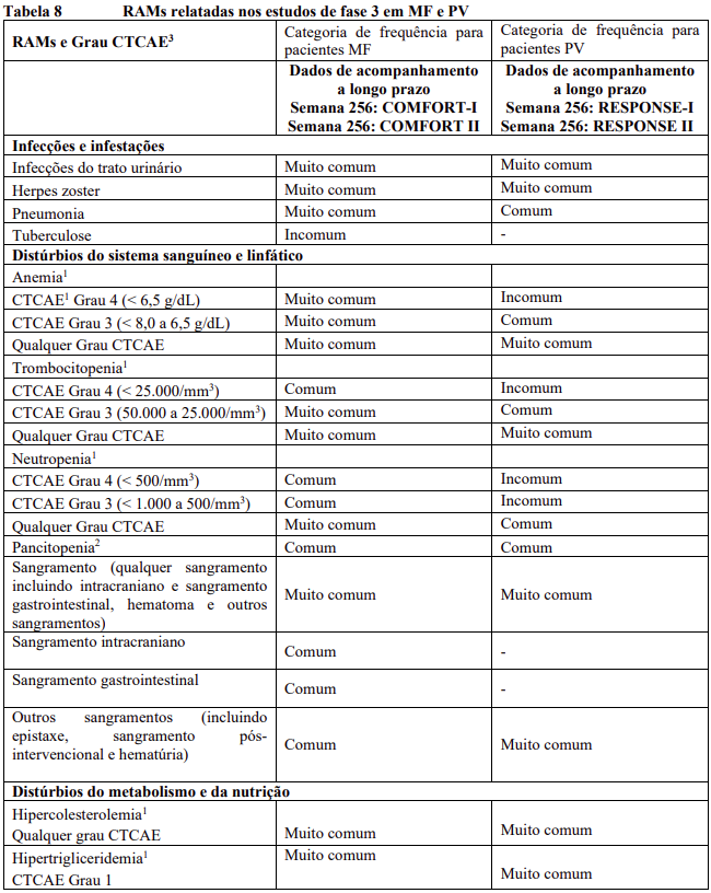 As RAMs a partir de estudos clínicos em MF e PV são listadas na Tabela 8. As RAMs a partir de estudos clínicos em DECH aguda e crônica estão listadas na Tabela 9 e as RAMs do estudo suporte na Tabela 10. Todas as RAMs estão listadas de acordo com a classe de sistema de órgão (SOC) do MedDRA.