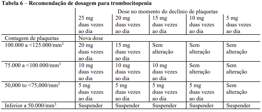 Para pacientes com DECH: Podem ser necessárias reduções de dose e interrupções temporárias do tratamento em pacientes com DECH com trombocitopenia, neutropenia ou bilirrubina total elevada após terapia de suporte padrão incluindo fatores de crescimento, terapias anti-infecciosas e transfusões. Recomenda-se etapa de redução de um nível de dose (10mg duas vezes por dia para 5mg duas vezes por dia ou 5mg duas vezes por dia para 5mg uma vez por dia). Em pacientes que são incapazes de tolerar com uma dose de 5mg uma vez ao dia, o tratamento deve ser interrompido.