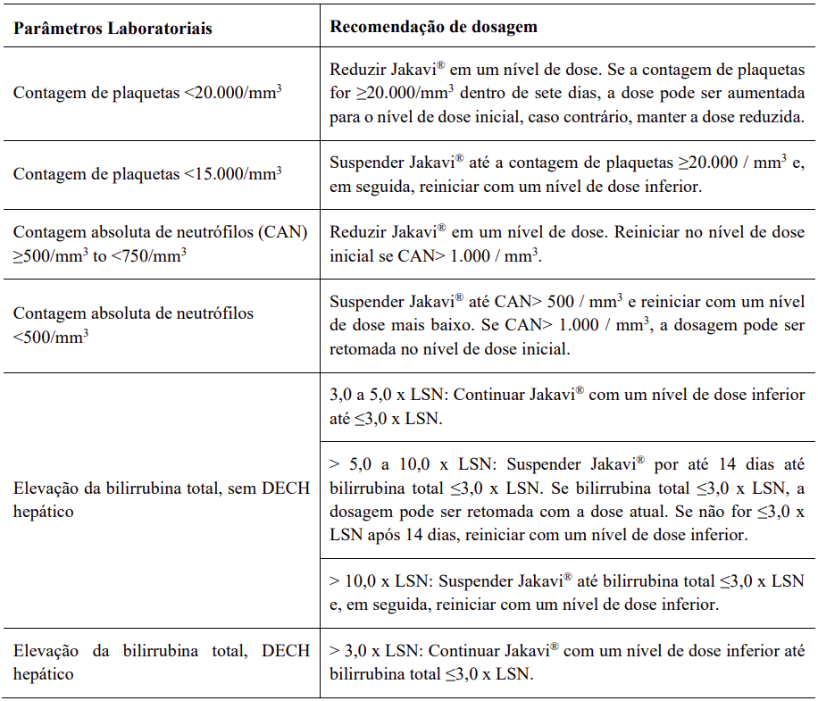 Em pacientes com MF com qualquer comprometimento hepático, a dose inicial recomendada baseada na contagem de plaquetas deve ser reduzida em aproximadamente 50% a ser administrada duas vezes ao dia. A dose inicial recomendada para pacientes com PV é de 5mg duas vezes ao dia. As doses subsequentes devem ser ajustadas com base em um monitoramento cuidadoso da segurança e da eficácia. Os pacientes diagnosticados com insuficiência hepática, enquanto receberem Jakavi®, devem ser cuidadosamente monitorados e podem precisar diminuir a dose para evitar RAMs. Devem ser realizados hemogramas completos, incluindo a contagem diferencial de leucócitos, monitorados pelo menos a cada uma a duas semanas durante as primeiras 6 semanas após o início do tratamento, e conforme indicado clinicamente após a sua função hepática e as contagens sanguíneas se estabilizarem. A dose pode ser titulada para reduzir o risco de citopenia. Em pacientes com DECH com qualquer comprometimento hepático, incluindo DECH hepático, nenhuma modificação da dose inicial é recomendada. Em pacientes com DECH com envolvimento hepático e aumento da bilirrubina total para > 3xLSN, as contagens sanguíneas devem ser monitoradas com mais frequência para toxicidade e uma redução de um nível de dose pode ser considerada.