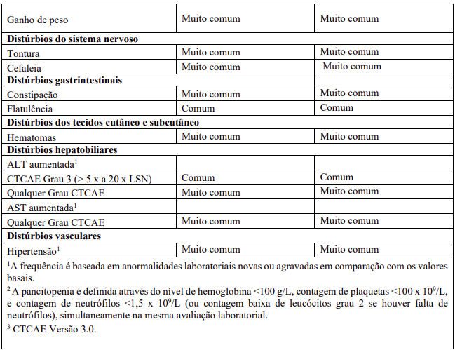 Dentro de cada classe de sistema de órgão, as RAMs são classificadas pela frequência, com as reações adversas a medicamentos mais frequentes aparecendo primeiro. Além disso, a categoria de frequência correspondente para cada RAM baseia-se na convenção a seguir (CIOMS III): muito comum (≥ 1/10); comum (≥ 1/100 a < 1/10); incomum (≥ 1/1.000 a < 1/100); rara (≥ 1/10.000 a < 1/1.000); muito rara (< 1/10.000). No programa de estudos clínicos a gravidade das RAMs foi avaliada com base nos CTCAE que definem como Grau 1 = leve, Grau 2 = moderada, Grau 3 = Grave e Grau 4 = ameaça à vida ou incapacitante, Grau 5 = morte.